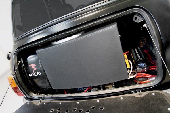 Installation de vitres électriques pour libérer de la place à l’intérieur des portières permettant d'acceuillir les hauts-parleurs FOCAL de 165mm - Réalisation d’un caisson de basse sur mesure recouvert de cuir noir avec attaches spécifiques anti-vibrations, avec Subwoofer 38cm FOCAL.